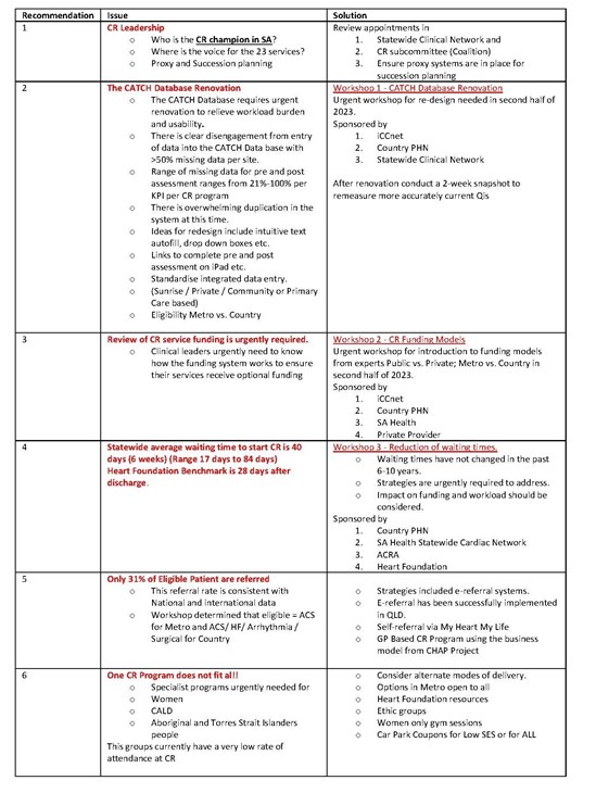 Following the 'Solutions for Evaluation of Quality Outcomes for Cardiac Rehabilitation in South Australia Workshop' held at SAHMRI on Friday 24 February 2023, six recommendations where provided to the Statewide Clinical Network to improve data collection, especially from Cardiac Rehabilitation Services.