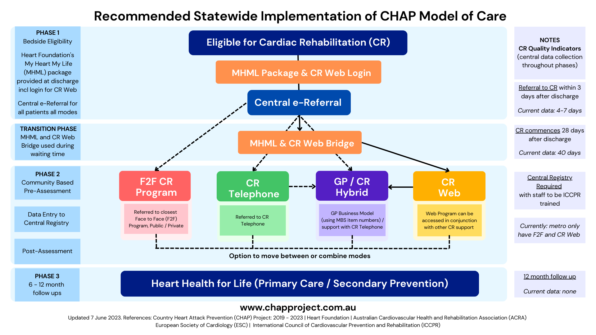 On request from the Statewide Cardiac Clinical Network, the CHAP team in conjunction with the SA Statewide Rehabilitation & Secondary Prevention Coalition developed a recommendation for a statewide implementation of CR care. This is the ultimate outcome for any implementation project and the success of the translation of CR evidence into practice.