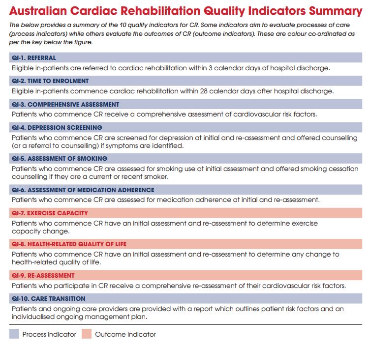 A survey was undertaken with 23 CR programs in SA providing a baseline for CR service quality improvement initiatives. The survey identifying gaps in measurement of the quality indicators, including post-assessment, HRQOL, medication adherence and exercise capacity and that services did not have data to calculate rate of referral with median wait time being 27 days.
